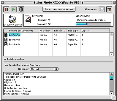 EPSON Spool Manager es parecido al Administrador de impresión de Windows. Si recibe dos o más trabajos de impresión a la vez, los coloca en una cola (con impresoras en red, también se denomina cola de impresión) según el orden de llegada. Cuando un trabajo de impresión llega al principio de la cola, EPSON Spool Manager lo envía a la impresora. Puede cancelar trabajos de impresión desde Spool Manager. También puede consultar información acerca del estado de la impresión de los trabajos enviados a este producto, así como hacer una pausa o reanudar los trabajos de impresión seleccionados.