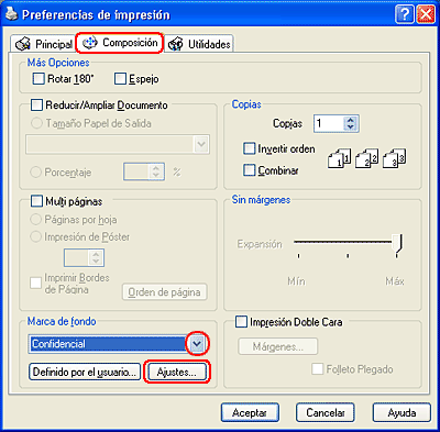 Haga clic en la ficha Composición, elija la marca de fondo deseada en la lista Marca de fondo y haga clic en Ajustes.