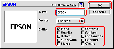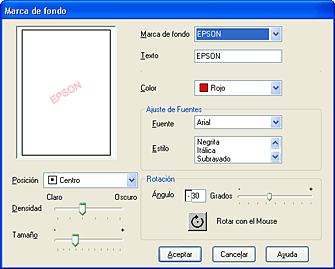 Asegúrese de haber elegido la marca correcta en la lista Marca de fondo y ajuste los valores de Color, Posición, Densidad, Tamaño, Fuente, Estilo de fuente y Ángulo. Si desea más detalles, consulte la ayuda on-line. Los ajustes que defina aparecerán en la parte izquierda del cuadro de diálogo.