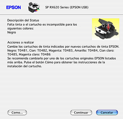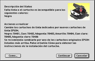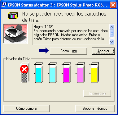 Si queda poca tinta o se agota, aparecerá un botón llamado Cómo. Si hace clic en Cómo, EPSON StatusMonitor le guiará paso a paso en el procedimiento de sustitución del cartucho.