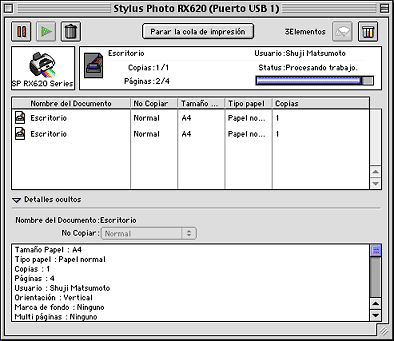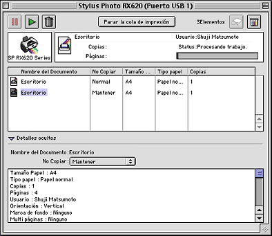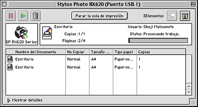 Después de enviar a este producto un trabajo de impresión, puede emplear la utilidad EPSON MonitorIV para comprobar, cancelar o cambiar la prioridad de los trabajos que se encuentran en la cola de impresión. Esta utilidad también muestra el estado del trabajo que se esté imprimiendo en ese momento.