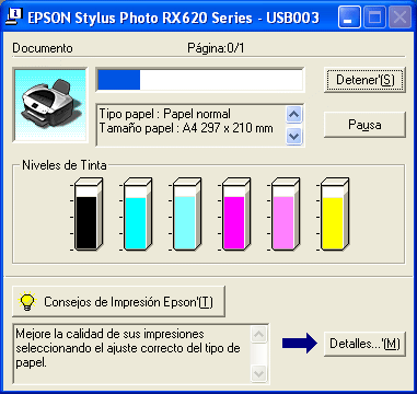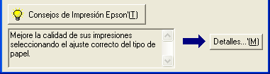 En el cuadro de texto situado en la parte inferior de la ventana del contador de avance, aparecen sugerencias para aprovechar al máximo el software de la impresora Epson. Cada 30 segundos se muestra un consejo nuevo. Si desea saber más sobre la sugerencia que aparece en pantalla, haga clic en el botón Detalles.