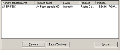 EPSON Spool Manager es parecido al Administrador de impresión de Windows. Si recibe dos o más trabajos de impresión a la vez, los coloca en una cola (con impresoras conectadas en red se denomina "cola de impresión") según el orden de llegada. Cuando un trabajo de impresión llega al principio de la cola, EPSON Spool Manager lo envía a este producto. En el Spool Manager, puede ver información sobre el estado de los trabajos de impresión enviados a este producto. También puede cancelar, realizar una pausa y reanudar los trabajos de impresión seleccionados.