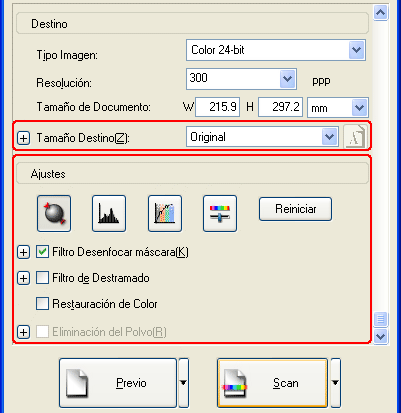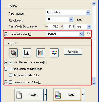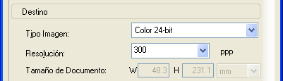 ![]() | Especifique el tipo de archivo de imagen resultante deseado con los ajustes de Destino. |