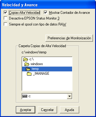 En el cuadro de diálogo Velocidad y avance, los usuarios de Windows pueden definir ciertos ajustes relativos a la velocidad de impresión. Haga clic en el botón Velocidad y avance del menú Utilidades del software de la impresora. Aparecerá el siguiente cuadro de diálogo.