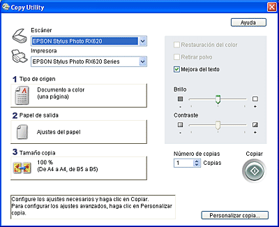 Utilice esta aplicación para convertir este producto en una fotocopiadora digital, aunque sus funciones son mucho más potentes y flexibles que las de las fotocopiadoras convencionales. Con esta aplicación, puede escanear e imprimir imágenes en la forma de fotografías. Puede copiar en diversos tamaños, y colocar varias fotos en la misma página. Antes de imprimir una imagen, puede ver los efectos de los ajustes en la ventana de previsualización. Cuando inicie esta aplicación, aparecerá la siguiente pantalla.