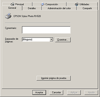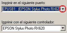Si EPUSBX: (EPSON Stylus Photo RX620) aparece en el cuadro de lista Imprimir en el siguiente puerto, significa que el controlador de dispositivo de impresora USB y el controlador de impresora están correctamente instalados. Si no aparece el puerto correcto, vaya al paso siguiente.