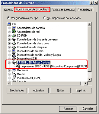 Si sus controladores están instalados correctamente, aparecerá Impresoras EPSON USB en el menú Administrador de dispositivos.