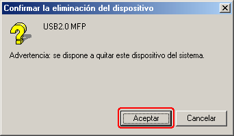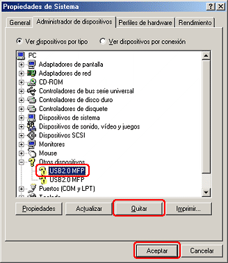 Bajo Otros dispositivos, seleccione USB MFP o EPSON Stylus Photo RX620. Después, haga clic en Quitar. Haga clic en Aceptar.