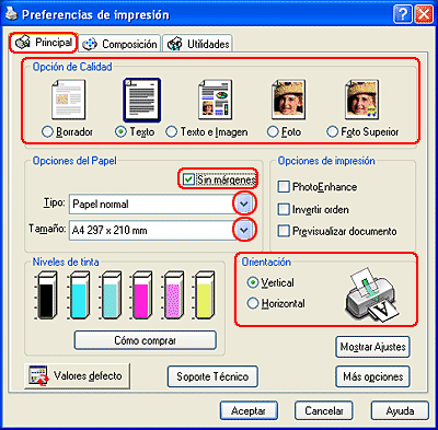 Cuando haya cargado el soporte, cambie los ajustes del controlador de la impresora por la impresión Sin márgenes.