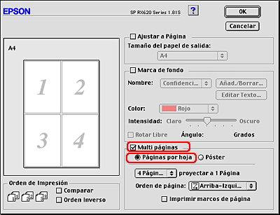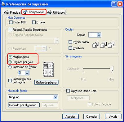 Seleccione la casilla de verificación Multi páginas en el cuadro de diálogo Disposición, y luego seleccione Páginas por hoja.