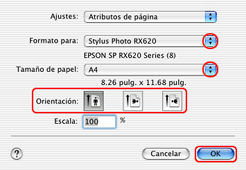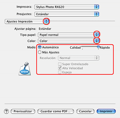 Seleccione Stylus Photo RX620 como el ajuste de Impresora.