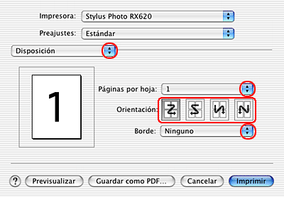 Esta función no está disponible si se ha seleccionado la casilla de verificación Sin márgenes del menú Principal (en Windows) o del cuadro de diálogo Ajustar página (en Mac OS 9).