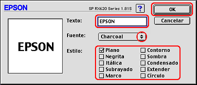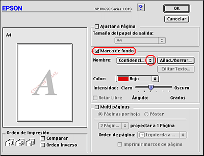 Asegúrese de haber elegido la marca correcta en la lista Marca de fondo y ajuste los valores de Color, Posición, Densidad, Tamaño, Fuente, Estilo de fuente y Ángulo. Si desea más detalles, consulte la ayuda on-line. Los ajustes que defina aparecerán en la parte izquierda del cuadro de diálogo.