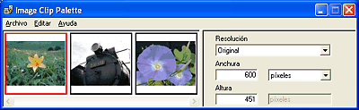 EPSON Image Clip Palette muestra las imágenes en forma de miniaturas y le permite ajustar la resolución y el tamaño de la imagen, así como arrastrarla y colocarla en la aplicación de destino sin cambiar la imagen original.