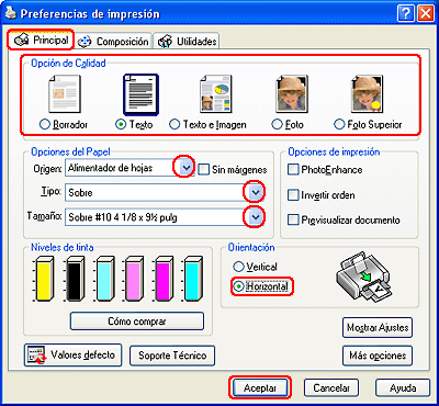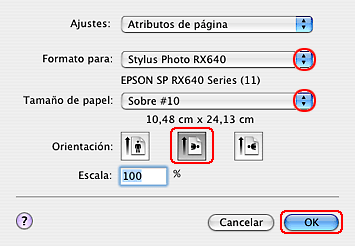 Seleccione el tamaño de sobre adecuado entre los ajustes de Tamaño disponibles. También puede definir un tamaño personalizado. Si desea más detalles, consulte la ayuda on-line.