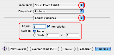 En Impresora, seleccione el mismo ajuste que seleccionó en Formato para en el paso 2. Después, configure los ajustes de Copias y páginas.