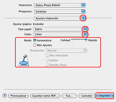 Seleccione Sobre como ajuste de Tipo papel y luego seleccione los ajustes de Color y Modo adecuados. Si desea más información sobre Ajustes impresión, consulte la Ayuda on-line.