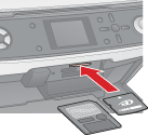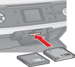 Inserte la tarjeta de memoria únicamente como se muestra en la tabla “Tarjetas compatibles y posiciones de inserción”, pues si no podría averiar la impresora, la tarjeta de memoria o ambos. Si inserta la tarjeta de forma incorrecta, aparecerá un mensaje de error en la pantalla LCD. Saque la tarjeta de memoria e introdúzcala correctamente.