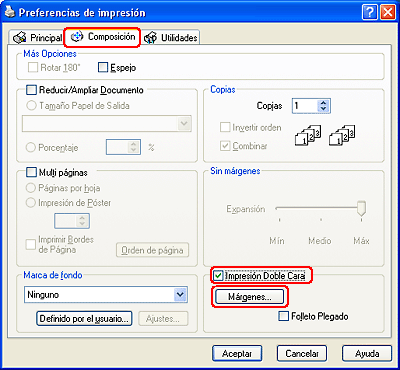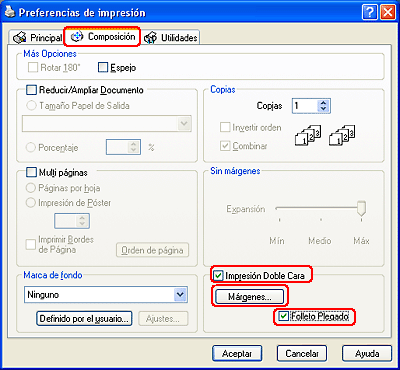 Haga clic en la ficha Composición y seleccione la casilla de verificación Impresión doble cara.