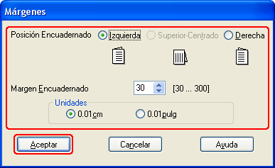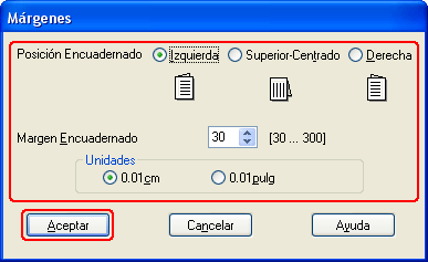 Elija entre cm o pulg. como el ajuste de Unidad. Especifique la anchura del margen de encuadernación.