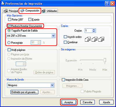Haga clic en la ficha Composición y seleccione la casilla de verificación Reducir/Ampliar documento.