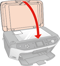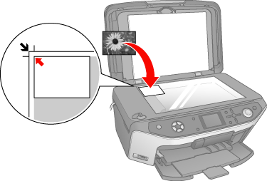Coloque el documento o foto sobre el vidrio de la superficie para documentos, boca abajo. Compruebe que la parte superior del documento o de la foto esté junto a la esquina superior izquierda de la superficie para documentos.