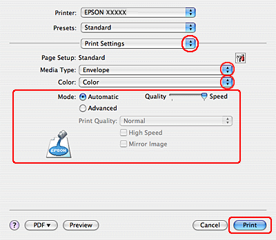 En el ajuste Media Type (Tipo papel), seleccione Envelope (Sobre). Después, seleccione los ajustes de Color y Mode (Modo) adecuados. Si desea más información sobre Print Settings (Ajustes Impresión), consulte la Ayuda on-line.