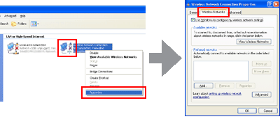 Haga clic, con el botón derecho del ratón, en Wireless Network Connection (Conexión de red inalámbrica), seleccione Properties. (Propiedades) y haga clic otra vez en la ficha Wireless Networks (Redes inalámbricas).