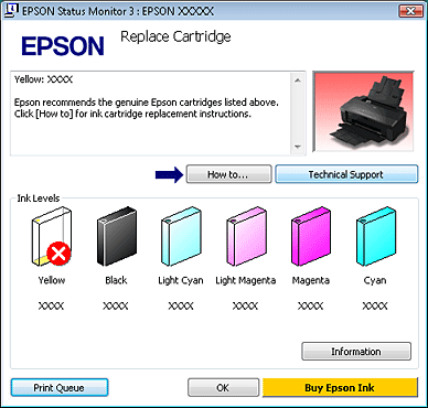 Kui tinti on vähe või see on otsas, kuvatakse nupp How to (Õpetus). Klõpsake How to (Õpetus) ja EPSON Status Monitor 3 juhatab teid samm-sammult läbi kassetivahetuse.