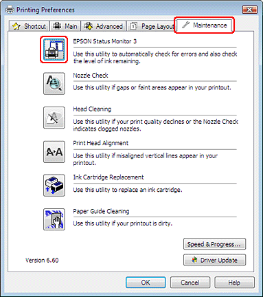 Katso Tehtäväpalkin pikakuvakkeesta, jos haluat lisätä pikakuvakkeen Windowsin tehtäväpalkkiin.Avaa tulostinohjain, valitse Maintenance (Huolto) -välilehti ja valitse EPSON Status Monitor 3 -painike.