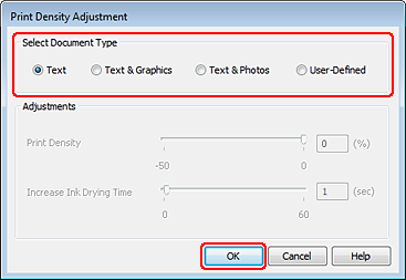 Valitse jokin Select Document Type (Valitse Asiakirjatyyppi) -asetuksista. Tämä säätää automaattisesti Print Density (Tulostuksen tummuus)- ja Increase Ink Drying Time (Nopeampi musteen kuivumisaika) -asetuksia.