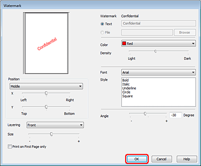 Watermark (Vesileima) -toiminnon avulla teksti tai kuva voidaan tulostaa vesileimaksi asiakirjaan.