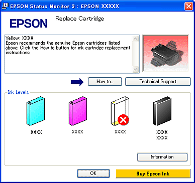 Kun muste on vähissä tai se loppuu, EPSON Status Monitor 3 -ikkunaan tulee How to (Miten) -painike. Kun How to (Miten) -painike valitaan, näyttöön tulee värikasetin vaihtamisohjeet ja tulostin siirtää tulostuspään oikeaan asentoon värikasetin vaihtamista varten.