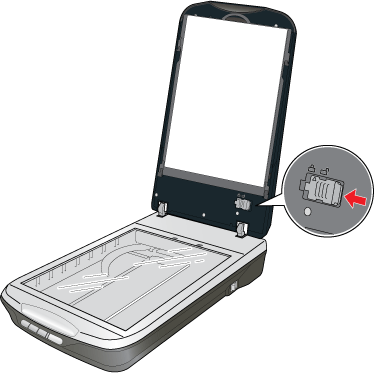 Avaa skannerin kansi ja työnnä kalvoyksikön kuljetuslukitus lukittuun asentoon. Sulje skannerin kansi.