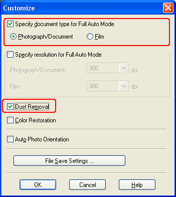 Full Auto Mode (Full Auto -tila): Napsauta Customize (Mukauta) -painiketta ja napsauta sitten Specify document type for Full Auto Mode (Anna asiakirjalähde Full Auto -tilaa varten) -valintaruutua ja valitse tarvittaessa alkuperäisen asiakirjan tyyppi. Valitse Dust Removal (Pölyn poisto) -valintaruutu ja napsauta OK (OK). Jatka vaiheesta 9.