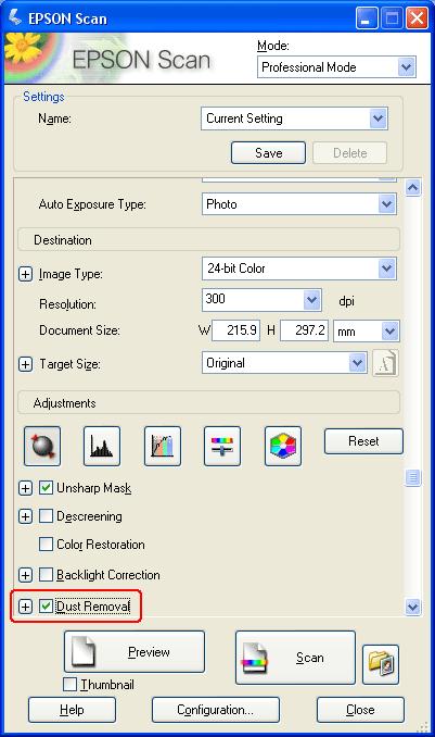 Pölyjälkien poistaminenEpson Scanin Dust Removal (Pölyn poisto)-toiminnon avulla voit “puhdistaa” alkuperäisistä pölyjäljet skannauksen aikana.