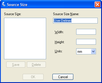 Jos haluamaasi kokoa ei ole Size (Koko) -luettelossa, voit luoda mukautetun koon. Napsauta Size (Koko) -luettelossa olevaa nuolta ja valitse Customize (Mukauta). Esiin tulee Source Size (Lähteen koko) -ikkuna.