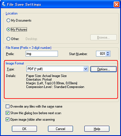 Valitse asiakirjallesi sopivat asetukset ja napsauta OK (OK). Palaat File Save Settings (Tiedoston tallennusasetukset) -ikkunaan.