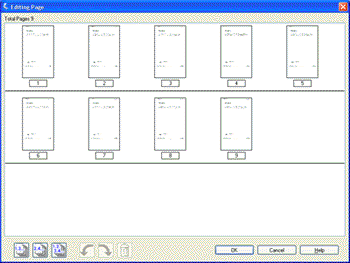 Editing Page (Sivun muokkaus) -ikkunassa näkyy pikkukuva jokaisesta skannatusta sivusta. Voit käyttää pääikkunan alareunassa olevia työkaluja, jos haluat valita asiakirjan sivun, kiertää sivua, järjestää sivut uudelleen tai poistaa sivuja. Saat lisätietoja napsauttamalla Help (Ohje)-painiketta.
