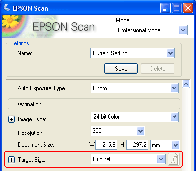 Skannauskoon valintaVoit skannata kuvat alkuperäisessä koossaan, mutta myös pienentää tai suurentaa niitä skannausvaiheessa. Pääset valitsemaan haluamasi koon Target Size (Kohteen koko) -asetuksissa sekä Home (Home-tila)- että Professional Mode (Professional-tila).