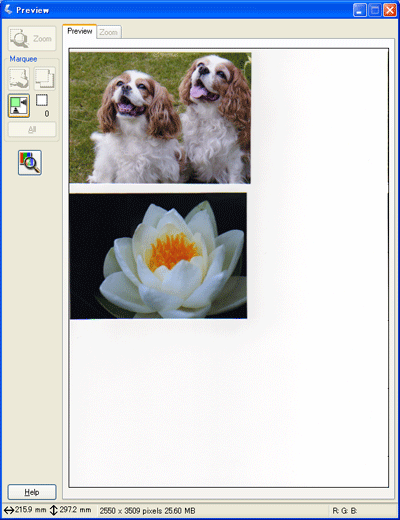 Jos haluat lähentää kuvaa, napsauta skannausalueen sisäpuolelle ja napsauta Zoom (Zoomaus) -painiketta. Epson Scan esiskannaa uudelleen ja näyttää suuremman esikatselukuvan Zoom (Zoomaus) -välilehdellä. (Muut kuvat näytetään edelleen alkuperäisessä koossaan Preview (Esikatselu) -välilehdellä.)