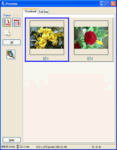 ![]() Epson Scan esiskannaa kuvasi ja näyttää ne yhdessä seuraavista Preview (Esikatselu) -ikkunoista.