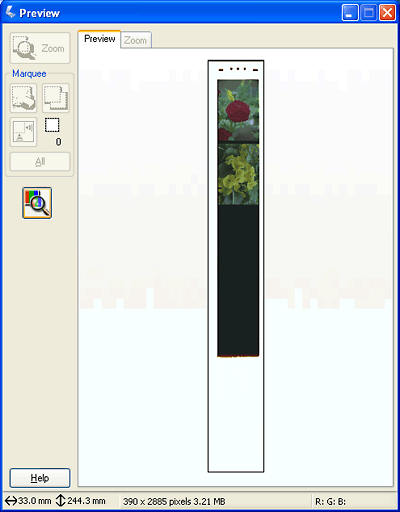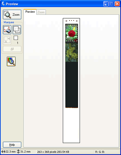 Jos haluat lähentää kuvaa, napsauta skannausalueen sisäpuolelle ja napsauta Zoom (Zoomaus) -painiketta. Epson Scan esiskannaa uudelleen ja näyttää suuremman esikatselukuvan Zoom (Zoomaus) -välilehdellä. (Muut kuvat näytetään edelleen alkuperäisessä koossaan Preview (Esikatselu) -välilehdellä.)