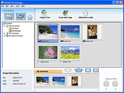 -käynnistysnäppäintä Home (Home-tila)- tai Professional Mode (Professional-tila)-tilassa, näytölle tulee File Save Settings (Tiedoston tallennusasetukset) -ikkuna. Siinä voit määritellä skannattujen tiedostojen nimen ja tallennushakemiston. Lisätietoja on kohdassa Näin valitset File Save Settings (Tiedoston tallennusasetukset). Kun skannaus on valmis, näet skannatut kuvat pikkukuvina Epson File Managerin ikkunassa.Jos haluat käyttää skannattuja kuvia Epson Creativity Suite -projektiohjelmissa, laita merkki jokaisen pikkukuvan alla olevaan valintaruutuun. Kuvat näytetään Epson File Manager -ikkunan alaosassa olevassa My Selection (Oma valikoima) -valintaruudussa.