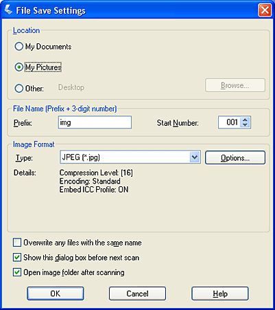 Professional Mode (Professional-tila) on paras vaihtoehto silloin, kun haluat esikatsella kuvat ja tehdä niihin suuria ja yksityiskohtaisia muutoksia ennen skannausta. Voit terävöittää kuvia, korjata niiden värejä ja parantaa niiden laatua lukuisilla työkaluilla, joita ovat muun muassa värin palautus, pölyn poisto, Digital ICE Technology ja Digital ICE Lite Technology (vain värifilmille/dioille) sekä taustavalon korjaus. Katso kohdasta Skannaustilan muuttaminen ohjeet Professional Mode (Professional-tila) siirtymiseksi. Katso skannauksen vaiheet kohdasta Perusasetusten valitseminen. Näin valitset File Save Settings (Tiedoston tallennusasetukset)Kun näyttöön tulee File Save Settings (Tiedoston tallennusasetukset) -ikkuna, sinun on valittava skannatulle kuvatiedostolle tallennuspaikka, nimi ja tallennusmuoto.