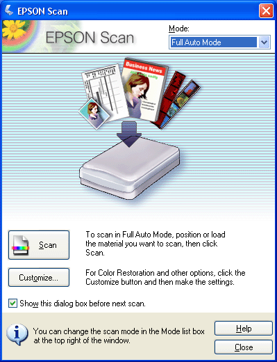 Full Auto Mode (Full Auto -tila) -tilassa voit skannata nopeasti ja helposti ilman asetusten valintaa ja kuvan esikatselua. Tämä on Epson Scanin oletustila.