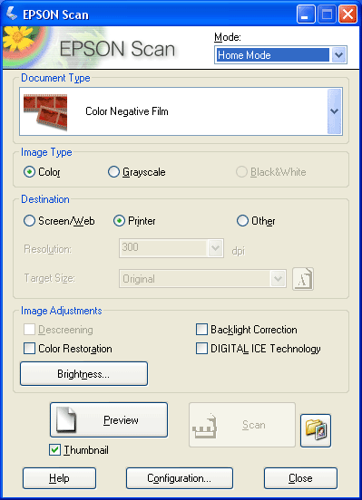 Destination (Kohde) asetukset. Nämä kertovat Epson Scanille skannattujen kuvien käyttötarkoituksen ja niiden perusteella se valitsee puolestasi kuvatarkkuudelle (skannauslaadulle) oikean oletusasetuksen.