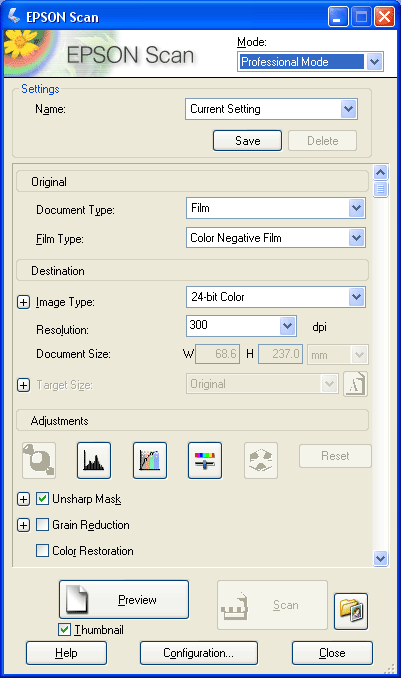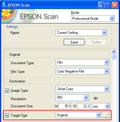 Original (Originaali) asetukset. Nämä kertovat Epson Scanille skannattavan filmin tai diojen tyypin.