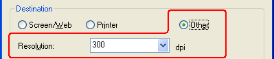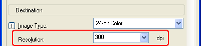 Jos skannaat kuvat koossa 100 % tai pienempänä etkä suurenna niitä myöhemmin, voit hyväksyä Epson Scanin valitseman Resolution (Tarkkuus) -asetuksen, joka perustuu antamiisi Destination (Kohde) -asetuksiin (vain Home Mode (Home-tila)-tilassa).